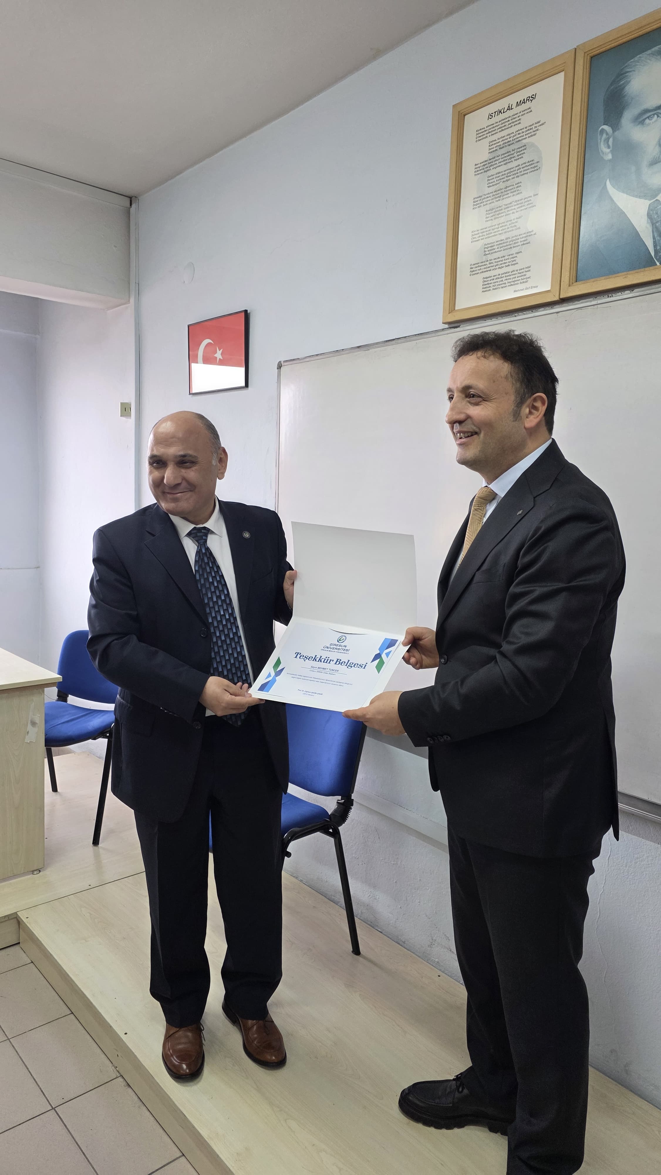 Ziyaretin sonunda Yüksekokul Müdür Yardımcımız Öğr. Gör. İsmail Bayram Giresun SMMM Odası Başkanı Mehmet Tuncer'e bir teşekkür belgesi takdim etti.